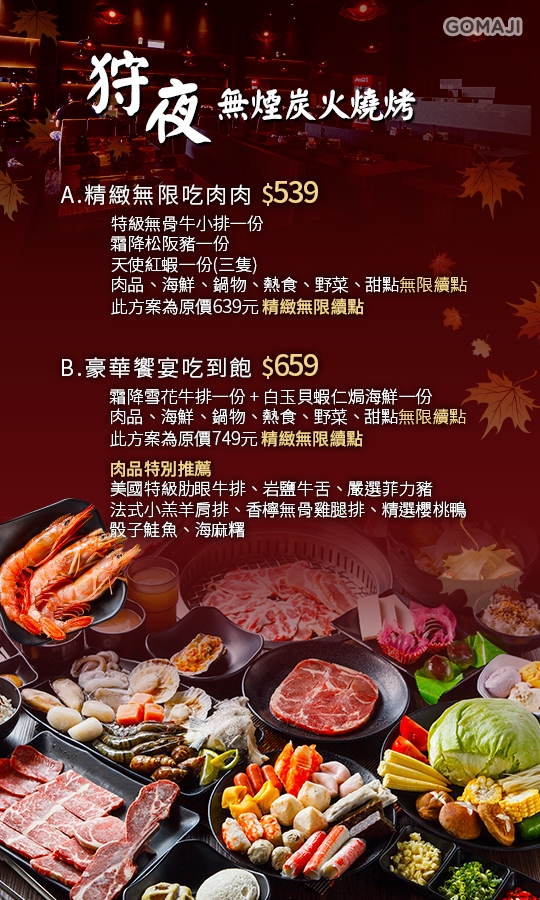 專營高品質美味燒烤!店內採原肉現點現切!【桃園 狩夜無煙碳火燒烤】推出超值優惠,各式鮮美的山珍海味一次囊括,搭配優質的環境,入內用餐完全沒有壓迫感!