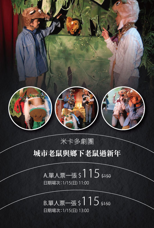 只要115元,即可享有【米卡多劇團】城市老鼠與鄉下老鼠過新年〈單人票一張,日期場次:1/15(日) 11:00、13:30〉