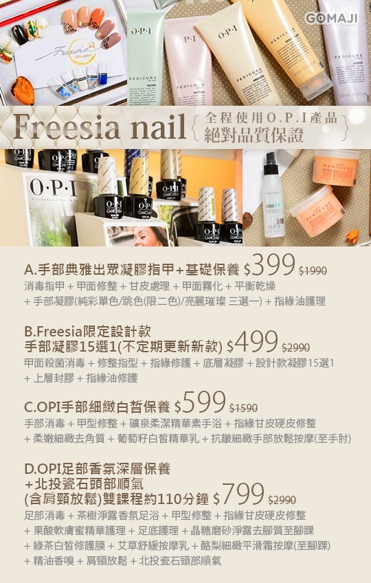 Freesia nail - 142740是最近關注的一項還算不錯的商品,一樣是在Gomaji上發現的。我真的非常喜歡逛Gomaji,尤其很多東西價格都很不錯,也有不少優惠券可以用,下面是賣場提供的商品簡介: