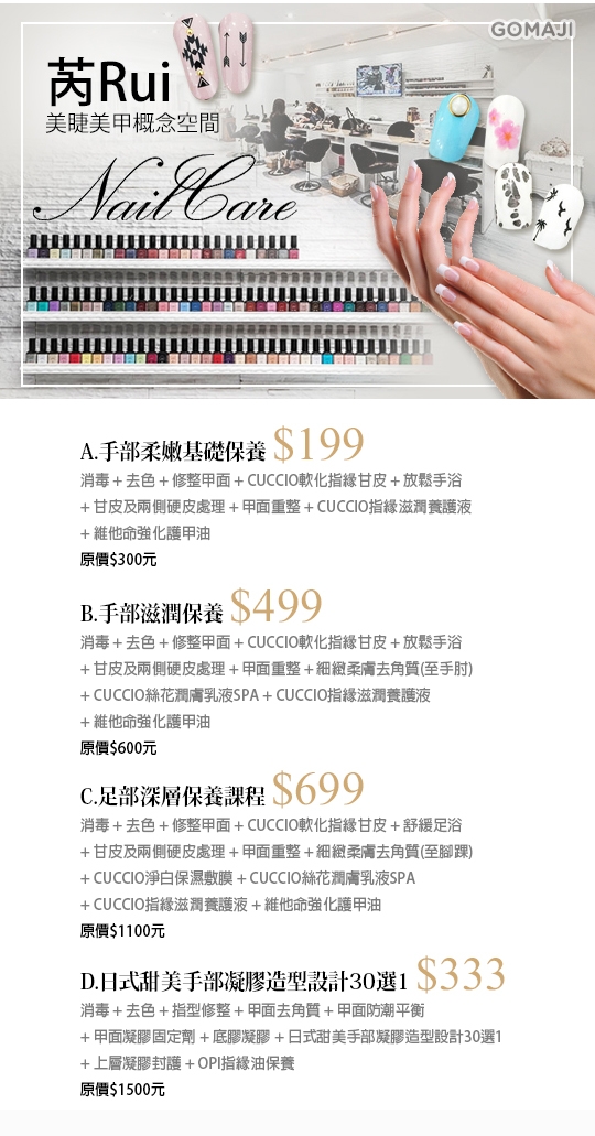 芮Rui美睫美甲概念空間 - 153677是最近關注的一項還算不錯的商品,一樣是在Gomaji上發現的。我真的非常喜歡逛Gomaji,尤其很多東西價格都很不錯,也有不少優惠券可以用,下面是賣場提供的商品簡介: