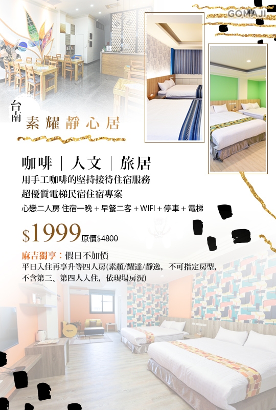 台南-素耀靜心居 - 159408是最近關注的一項還算不錯的商品,一樣是在Gomaji上發現的。我真的非常喜歡逛Gomaji,尤其很多東西價格都很不錯,也有不少優惠券可以用,下面是賣場提供的商品簡介: