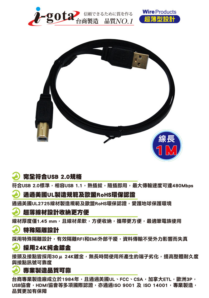 有關i-gota 薄型 USB 2.0 連接線 A公-B公 1米.的詳細介紹如下: i-gota 薄型 USB 2.0 連接線 A公-B公 1米